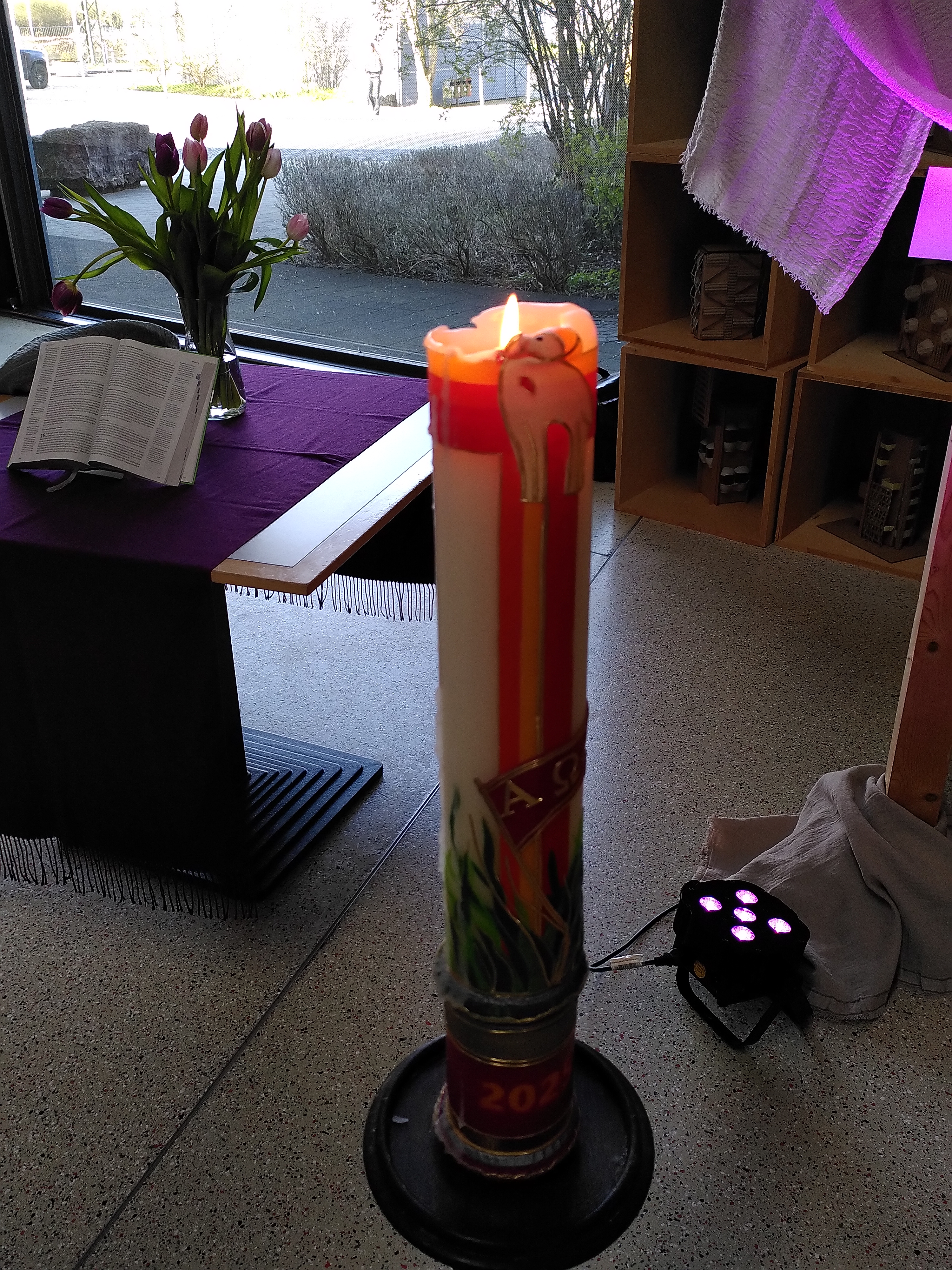 Am Freitag, den 27.03.26 kamen etwa 100 interessierte Schülerinnen und Schüler – also ein Viertel der Schülerschaft – sowie einige Lehrkräfte in der ersten Stunde in der passend ausgeleuchteten Aula zusammen, um bei dieser Premiere dabei zu sein. Eingestimmt wurden sie von der motivierenden Gottesdienstband mit dem sehr gut einstudierten Worship-Song „Lead me to the cross“. Es folgten zwei kleine Sprechstücke der Klasse 6 a und 6 b zu Begriffen rund um Ostern sowie zur Passion Jesu, letzteres musikalisch umrahmt mit Schlagwerk und dem Lied „Kreuz auf das ich schaue“ aus dem katholischen Gesangbuch. Beim Klassiker „O happy day“ brachte die Band die Gemeinde zum antwortenden Mitsingen, bevor die bis dahin verhüllte Osterkerze (eine freundliche Leihgabe der evangelischen Kirchengemeinde Singen) entzündet wurde. Mit Fürbitten der Klasse 5 c, die ans Kreuz geheftet wurden, und dem allseits bekannten Song „My lighthouse“ (der auferstandene Jesus als unser Licht, das uns Orientierung in der Dunkelheit von Leid und Tod gibt) endete dieser erste Ostergottesdienst. Mögen ihm noch viele weitere folgen.
